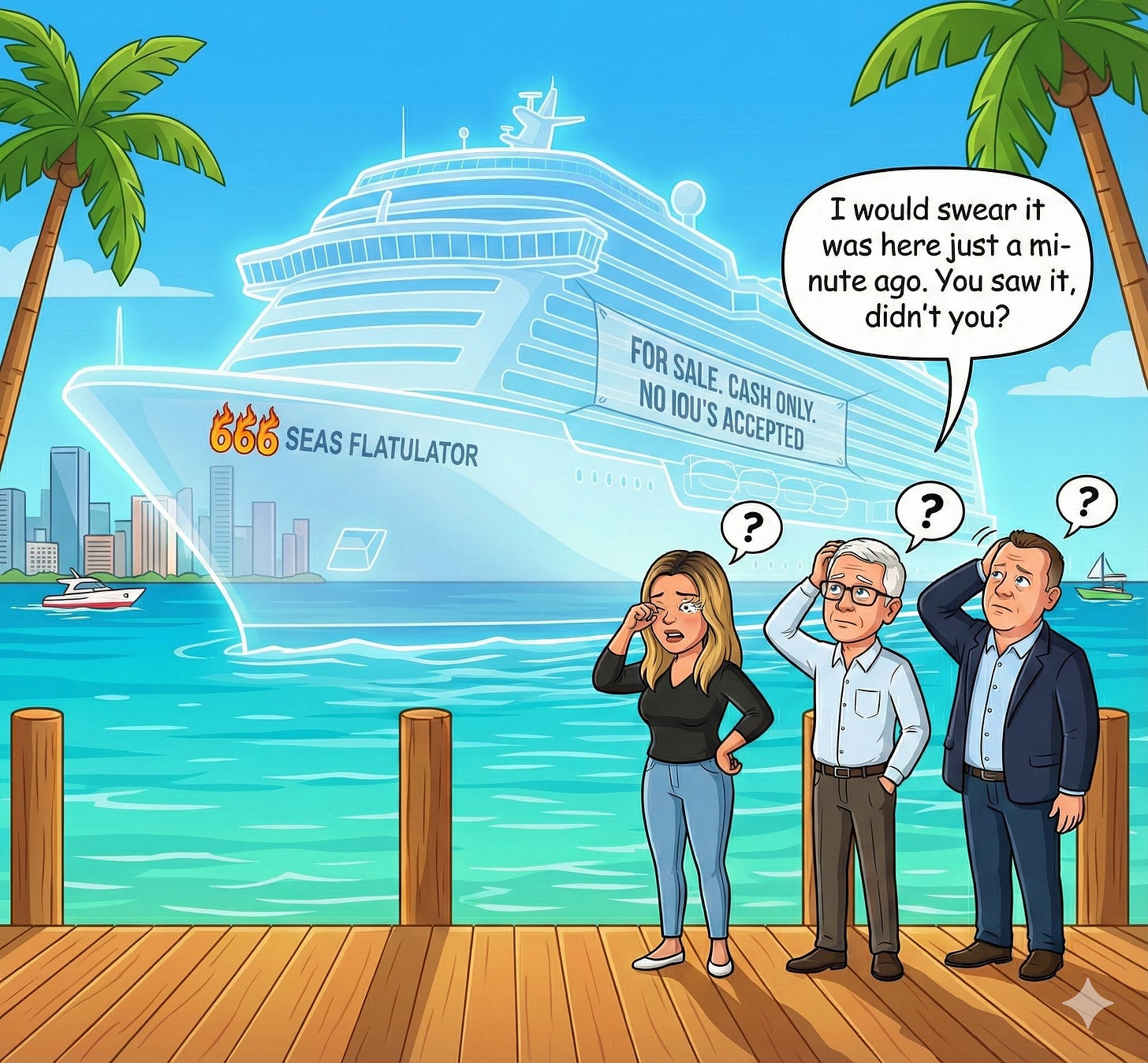 Operating a cruise ship is extremely expensive, especially when the ship is older and in constant need of regular maintenance and unexpected repairs. In that regard, Odyssey is no different and with cabin sales not meeting expectations despite innumerable creative sales programs being introduced, the budget is an alligator in need of continual feeding. Due to the overly-optimistic sales projections and miscalculation of other expenses, it is our understanding that management has been forced to go to the well on numerous occasions with multiple cash calls. And just when things were looking grim with the sudden unexpected exit of multiple high-profile social media cheerleaders…