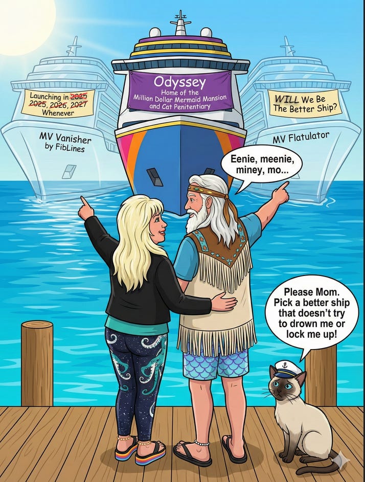 Will the slick DCHG Dynamic Duo return to take a window cabin (with a chair!) on the ultra-luxury “phantom” ship and then upgrade within weeks to a veranda cabin and commence a hard sell of the new endeavor, throwing away their stated desire for “slow travel”?